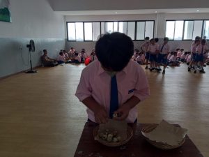 Setelah itu dilanjutkan dengan bernyanyi bersama yang dipimpin oleh pembawa acara Bu Martha dan Bu Lusi. Acara dilanjutkan dengan lomba menghias telur paskah di kelas masing-masing untuk kelas I-III dan mengupas telur puyuh di ruang aula untuk kelas IV-VI.